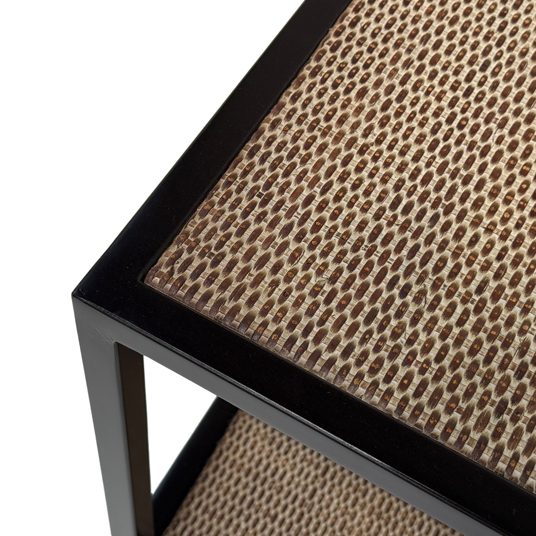 The Atticus Rectangular Coffee Table pairs a streamlined black iron frame with a dark rattan top and coordinating lower shelf. Its balanced proportions and tactile finishes create a grounded centrepiece that suits both modern and relaxed interiors.