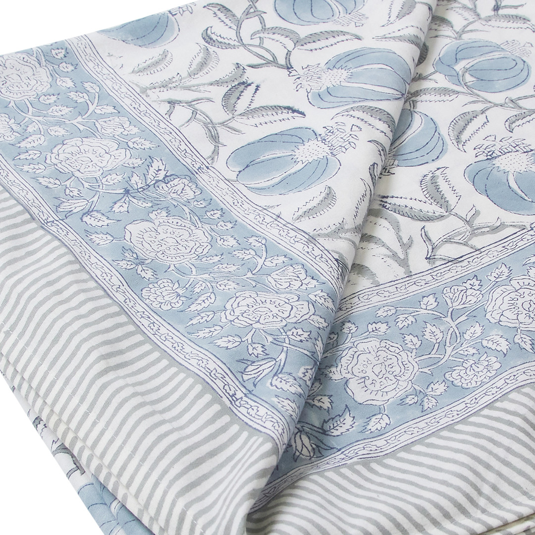 The Fernleigh Tablecloth is crafted from 100% cotton and features soft blue botanical motifs on a crisp white base. A detailed floral border and coordinating striped edge frame the design beautifully, adding structure and contrast.