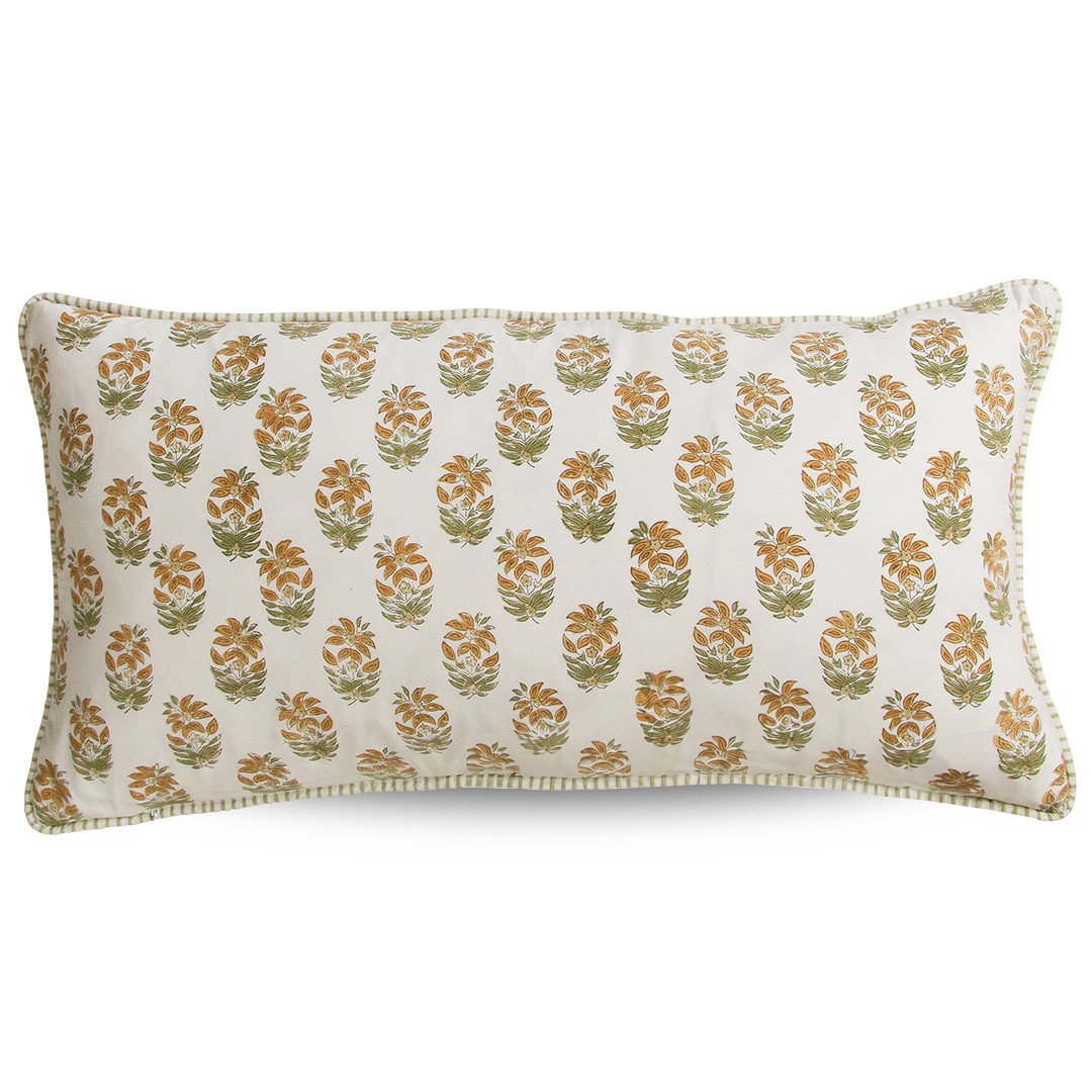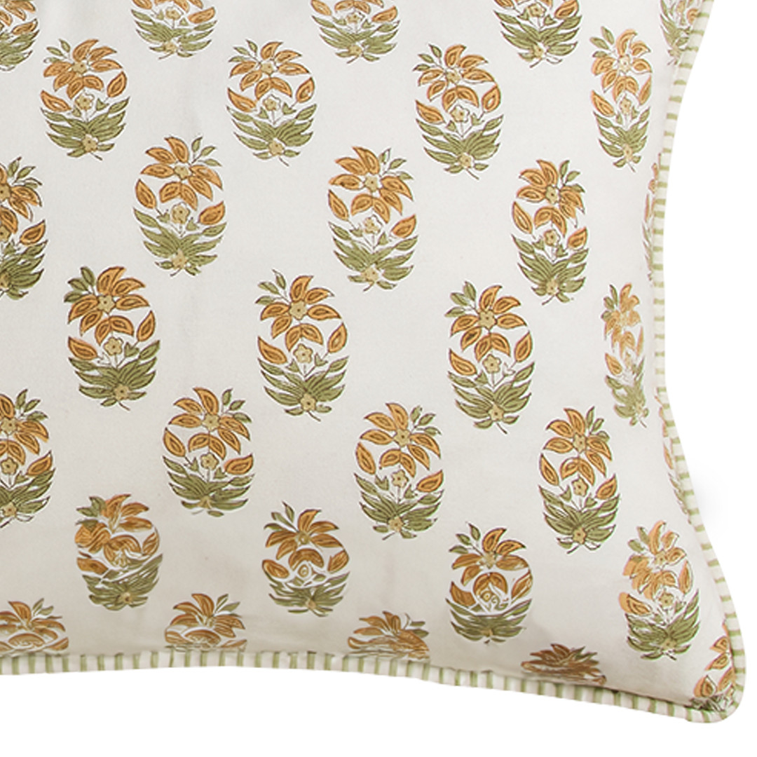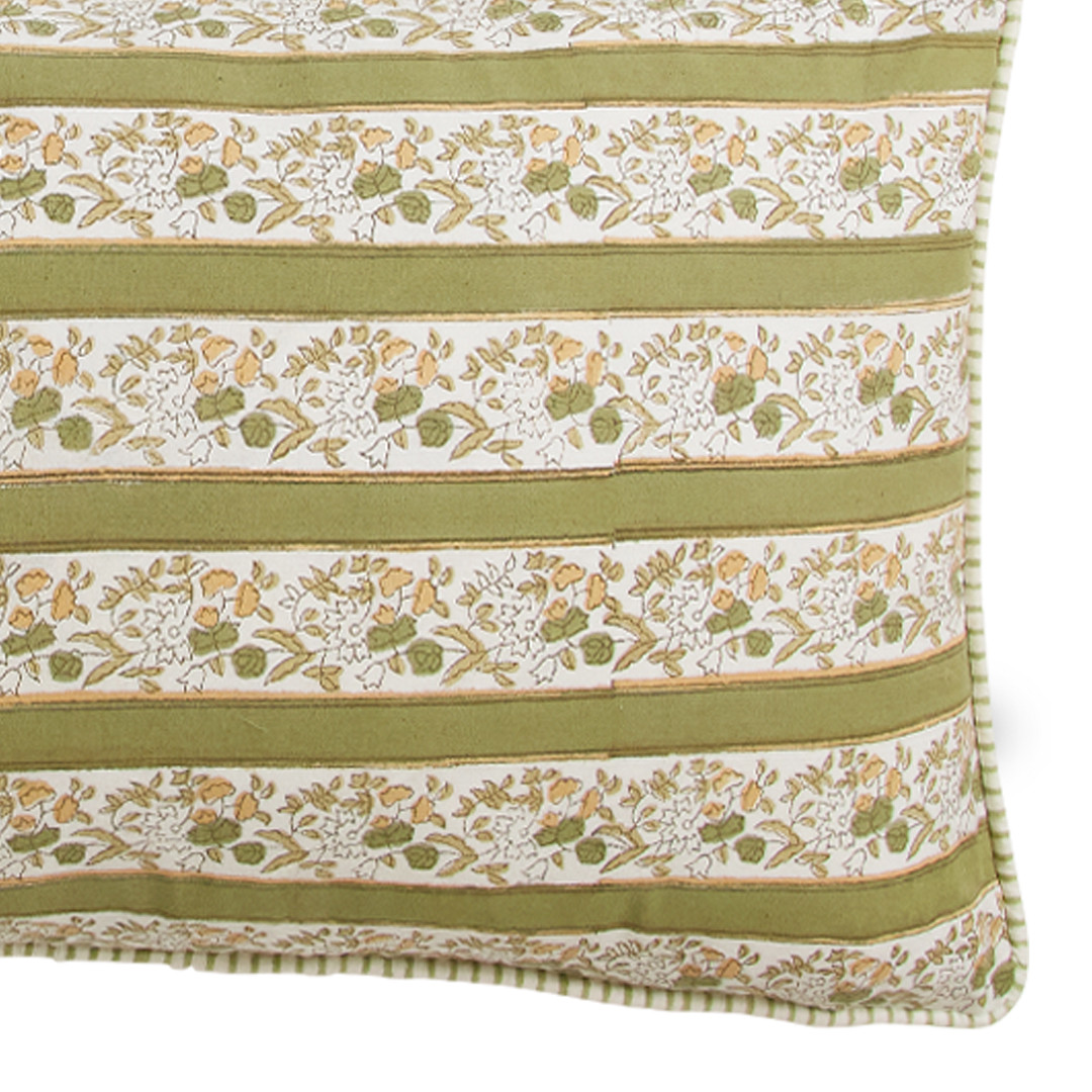 The Garden Path Petal Cushion pairs timeless striped detailing with delicate botanical florals for effortless layering. The front features classic sage stripes for a fresh, structured look, while the reverse reveals a soft, repeating floral motif in calming sage and warm ochre tones for added versatility.