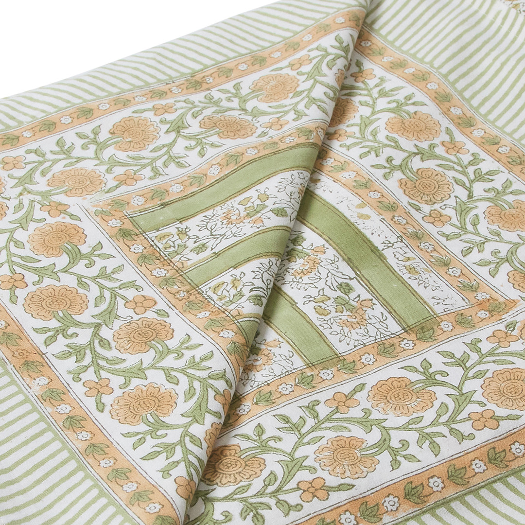 Set the scene for relaxed gatherings with the Garden Path Tablecloth. Framed by a soft sage striped border and intricate floral detailing, this design captures the charm of a blooming garden in full flourish. Warm ochre accents and delicate vine motifs create a beautifully balanced pattern that feels both timeless and fresh.