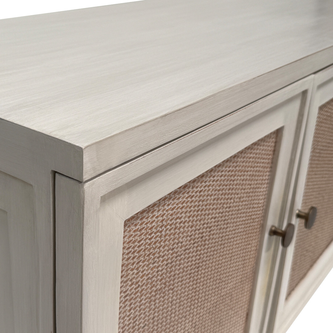 The Raffles Entertainment Unit continues the collection’s refined British Colonial influence, pairing clean-lined form with woven cane detailing for a look that feels both classic and contemporary. Crafted from solid timber with a softly washed finish, it features inset cane door panels and understated hardware, bringing warmth and texture to living spaces. Generous internal storage offers a practical solution for media and accessories, while the elongated silhouette makes it an elegant focal point for relaxed, well-considered interiors.