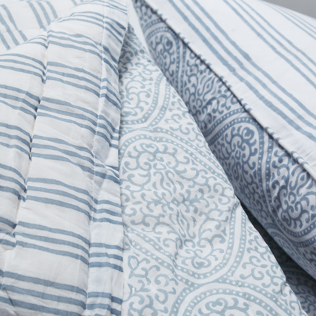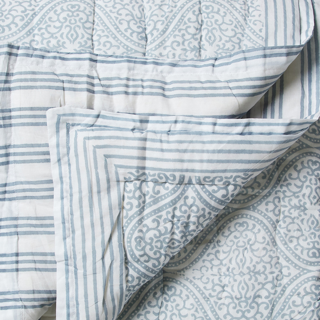 The Twilight Quilt blends soft blue tones with intricate, medallion-inspired patterning for a look that feels both classic and calming. Framed with coordinating striped borders, it’s thoughtfully layered to create depth and quiet detail.
