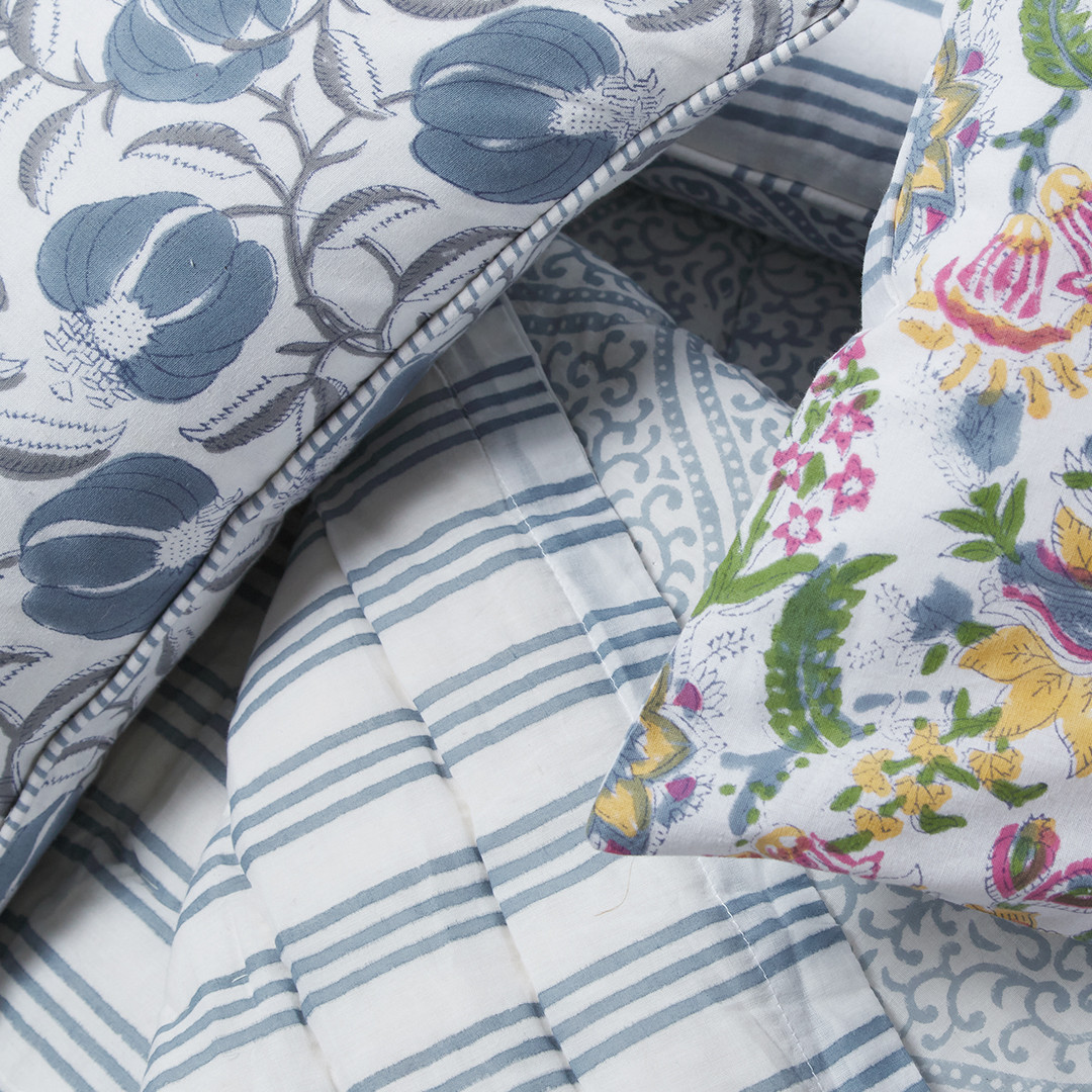 The Twilight Collection is a layered celebration of print and pattern, blending soft blue botanicals with delicate stripes and intricate detailing. Inspired by traditional hand-block designs, each piece feels thoughtfully curated, where florals, borders and subtle geometrics come together in harmony.